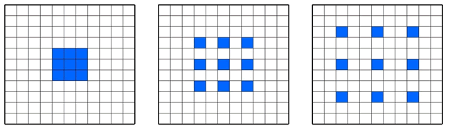 简而言之,在扩张值为 D 的扩张卷积中,通常步长是 1,你也可使用其他的步长。下图给出了一个例子,扩大(孔)尺寸为 0,1,2: