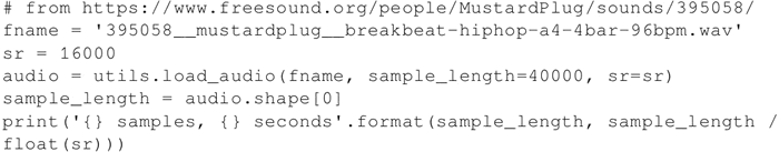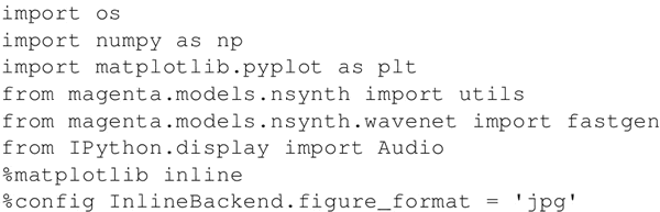 从网上下载安装一个预先建立的模型(http://download.magenta.tensorflow.org/models/nsynth/wavenet-ckpt.tar)并下载示例声音(https://www.freesound.org/people/MustardPlug/sounds/395058/),然后运行 demo 目录中的笔记。第一部分包含了稍后将在计算中使用的模块: