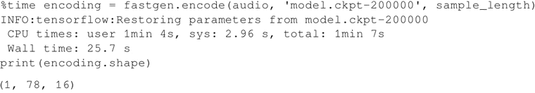 使用从互联网上下载的预先训练的 NSynth 模型以非常紧凑的表示方式对音频样本进行编码。每 4 秒给一个 78×16 的尺寸编码,然后可以解码或重新合成。编码是张量(#files=1x78x16):