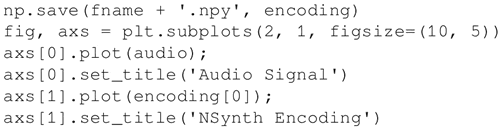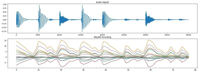 我们观察如下图所示的音频信号和 NSynth 编码: