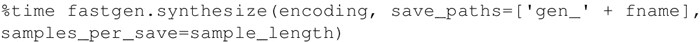 现在对刚刚制作的编码进行解码。换句话说,如果重新合成的声音类似于原来的,这里试图以紧凑表示再现对原始音频的理解。事实上,如果你运行实验并听取原始音频和重新合成的音频,会感觉它们听起来非常相似: