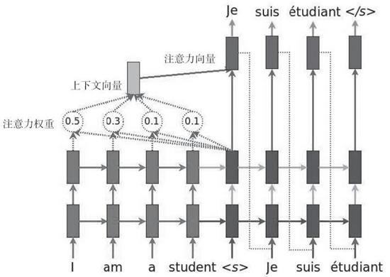 注意力的思想是 2015 年在论文“Neural Machine Translation by Jointly Learning to Align and Translate”(Dzmitry Bahdanau,Kyunghyun Cho和Yoshua Bengio,ICLR,2015)中提出的,它需要在编码器和解码器 RNN 之间增加额外的连接。事实上,仅将解码器与编码器的最新层连接会存在信息瓶颈,而且不一定能够传递先前编码器层的信息。