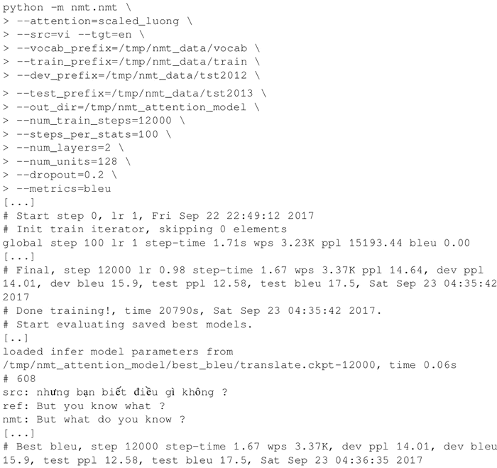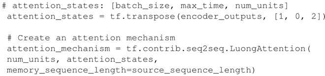 通过使用库 tf.contrib.seq2seq.LuongAttention 来定义注意力机制,该库实现了文献“Effective Approaches to Attention-based Neural Machine Translation”(Minh-Thang Luong,Hieu Pham和Christopher D.Manning,2015)中定义的注意力模型: