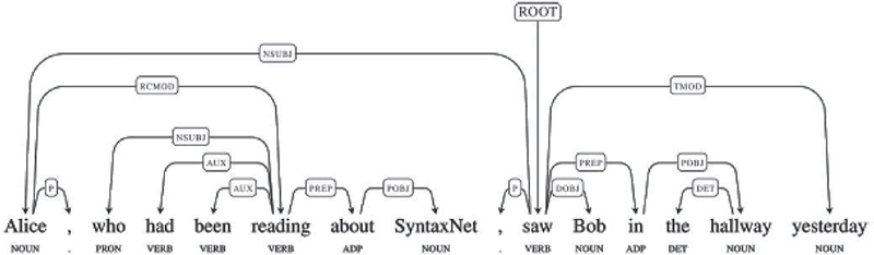 seq2seq 的另一个应用是 SyntaxNet,又名 Parsey McParserFace(一个句法分析器,https://research.googleblog.com/2016/05/announcing-syntaxnet-worlds-most.html),这是许多 NLU 系统上的一个关键组件。在这个系统中输入一个句子,它会自动给句子中的每一个单词打上 POS(Part-of-Speech)标签,用来描述这些词的句法功能,并在依存句法树中呈现。这些句法关系直接涉及句子的潜在含义。