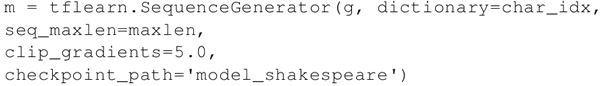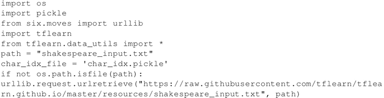 为了简单起见,这里将使用基于 TensorFlow 运行的框架 TFLearn,这里所使用的例子只是标准版的一部分(参考https://github.com/tflearn/tflearn/blob/master/examples/nlp/lstm_generator_shakespeare.py),所开发的模型是字符级 RNN 语言模型,考虑的序列则是字符序列而不是单词序列。