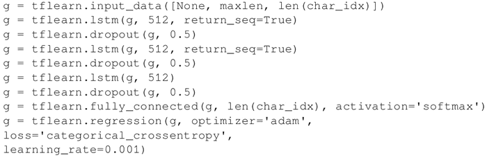 定义由三个 LSTM 组成的 RNN,每个 LTSM 有 512 个节点,并返回完整序列而不是仅返回最后一个序列。请注意,使用概率为 50% 的 drop-out 模块来连接 LSTM 模块。最后一层是全连接层,softmax 长度等于字典尺寸。损失函数采用 categorical_crossentropy,优化器采用 Adam: