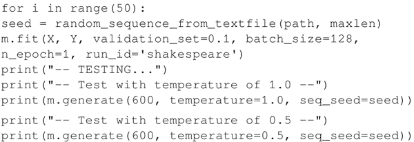 经过 50 次迭代,从输入文本中选取一个随机序列并生成一个新的文本。温度参数控制所创建序列的多样性;接近于 0 的温度创建的序列看起来就像用于训练的样本,温度越高,结果越多样: