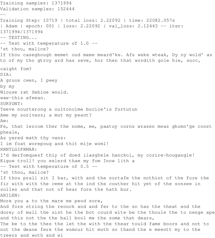 当一件新的未知或遗忘的艺术作品需要被鉴定归于某位作者时,就会有著名学者将这件作品与作者的其他作品进行比较。学者们所做的是在作者已知作品的文本序列中寻找共同特征,并希望在鉴定作品中找到相似的特征。本节的工作方式与之前的相似:RNN 学习莎士比亚作品中的特征,然后这些特征被用来产生新的、从未见过的文本,这些文本很好地代表了最伟大的英国作家的写作风格。来看执行示例: