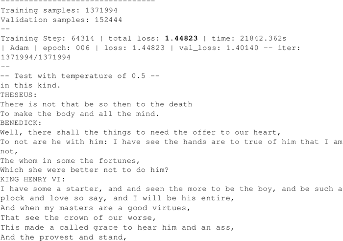 本节的工作方式与之前的相似:RNN 学习莎士比亚作品中的特征,然后这些特征被用来产生新的、从未见过的文本,这些文本很好地代表了最伟大的英国作家的写作风格。来看执行示例: