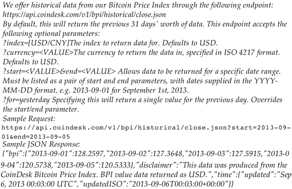 核心思想是过去观察到的价格时间序列为未来价格提供了一个很好的预估器。给定时间间隔的比特币值通过https://www.coindesk.com/api/的 API 下载,以下是 API 文档的一部分: