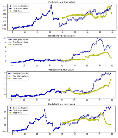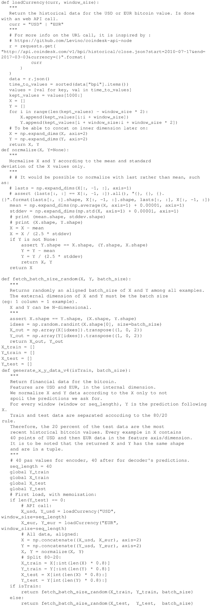 在上述 GitHub 库基础上,考虑使用以下能够下载和标准化比特币历史值(美元或欧元)数据的函数,这些函数在 dataset.py 中定义。训练集和测试集根据 80/20 规律分开,因此,20% 的测试数据是最新的比特币值。每个示例都包含 40 个美元(USD)数据点,特征轴/维度上是欧元(EUR)数据。数据根据均值和标准差进行归一化处理,函数 generate_x_y_data_v4 生成尺寸为 batch_size 的训练数据(或测试数据)的随机样本: