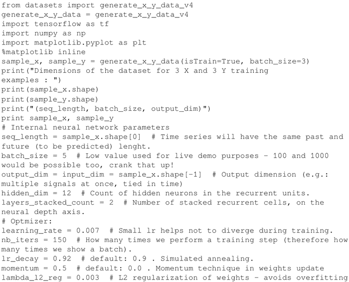 生成训练集、验证集和测试集,并定义一些超参数,例如 batch_size、hidden_dim(RNN 中隐藏神经元的数量)和 layers_stacked_count(堆栈循环单元的数量)。另外,定义一些用于微调优化器性能的参数,例如优化器的学习率、迭代次数、优化器模拟退火的 lr_decay、优化器的动量以及避免过拟合的 L2 正则化。请注意,GitHub 存储库默认 batch_size=5和nb_iters=150,但我设置 batch_size=1000和nb_iters=100000,已经获得了更好的结果: