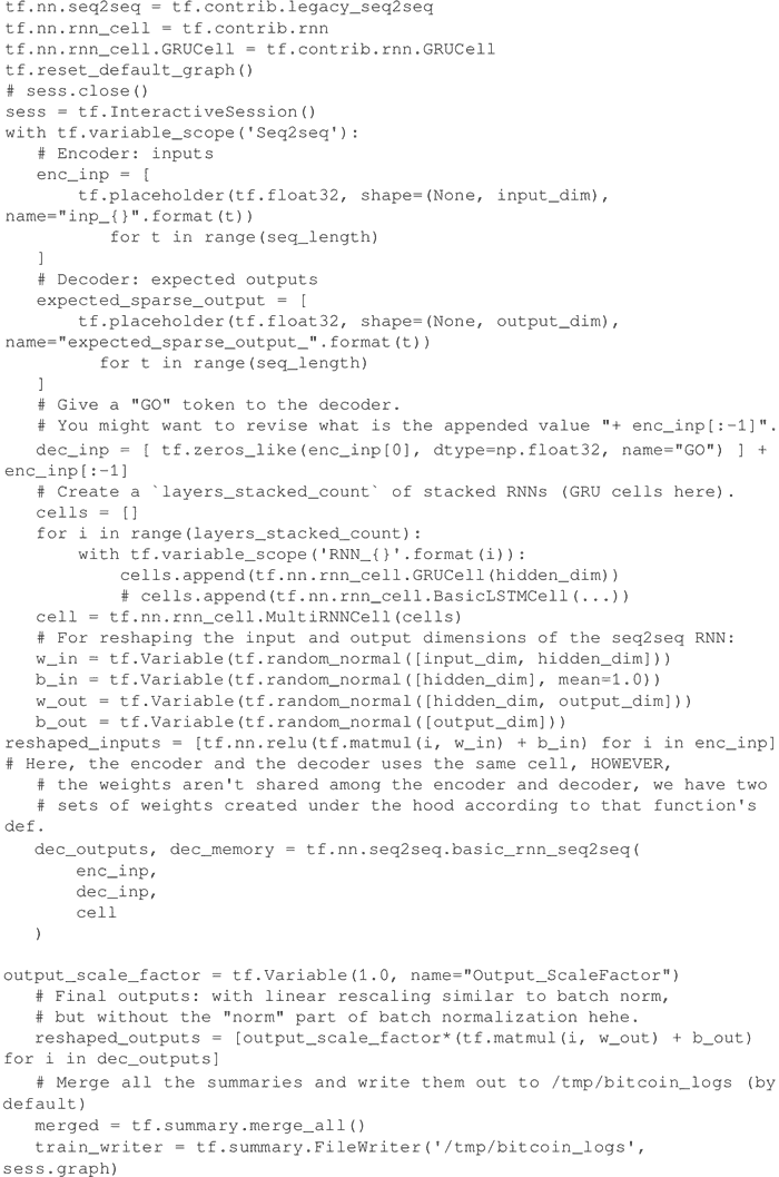 将网络定义为由基本 GRU 单元组成的编码器–解码器。网络由 layers_stacked_count=2 个 RNN 组成,使用 TensorBoard 对网络进行可视化。请注意,hidden_dim=12 是循环单元中隐藏的神经元: