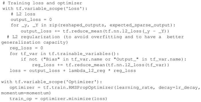 定义一个 L2 正则化损失函数,以避免过度拟合并具有更好的泛化能力。优化器选择 RMSprop,其中 learning_rate、decay 和 momentum 的值在第 3 步中已给出: