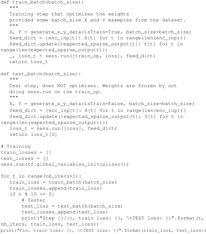 生成训练数据并在数据集的 batch_size 示例上运行优化程序,为批量训练做好准备。同样,从数据集的 batch_size 示例生成测试数据,为测试做好准备。训练运行迭代次数为 nb_iters+1,并每训练 10 次迭代来测试一次结果:
