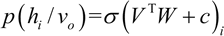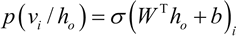 正向传播:可见层(V)已知,利用权重(W)和偏置(c)采样出隐藏层(h0),根据下式的随机概率(σ 是随机概率),隐藏单元开启或关闭: