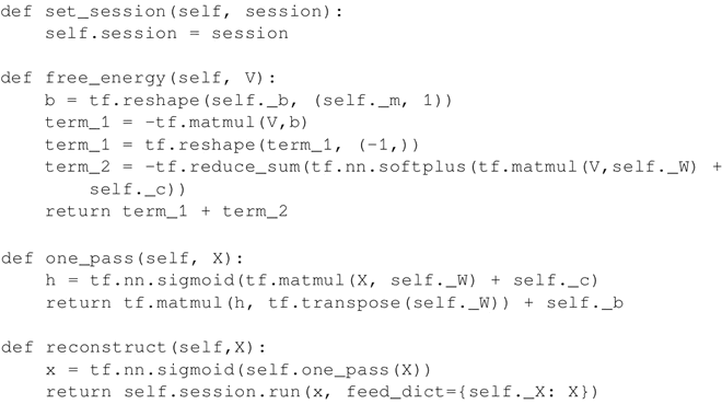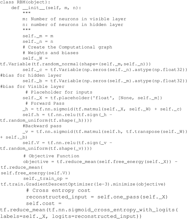编写一个类 RBM 来完成主要工作。__init__ 中将构建完整的计算图、正向传播、反向传播和目标函数,此处使用 TensorFlow 内置的优化器来更新权重和偏置: