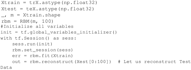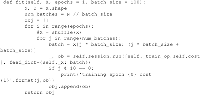 在 RBM 类中定义 fit() 方法,在 __init__ 中声明所有的操作之后,训练操作就是简单地在会话中调用 train_op。我们使用批量训练: