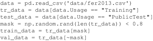 完整的数据在 fer2013.csv 文件中,从其中分离出训练、验证和测试数据:
