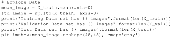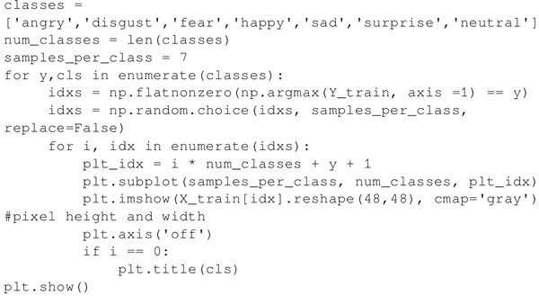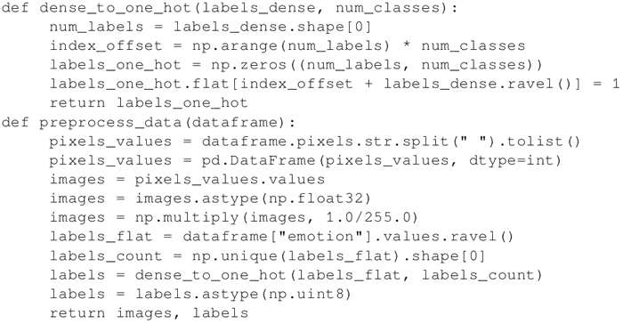 需要对数据进行预处理,将像素和情绪标签分开。为此,构建两个函数,函数 dense_to_one_hot() 为标签执行独热编码,函数 preprocess_data() 将每个像素分隔成一个数组,利用这两个函数生成训练、验证和测试数据集的输入特征和标签: