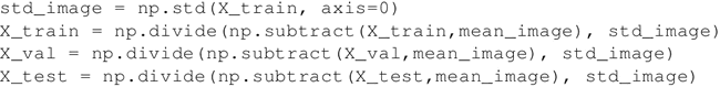 这里的准确度在很大程度上取决于图像表示。在前面的章节中没有进行图像处理,只有缩放比例为 0 到 1 之间的灰度图像,但是如果按照链接http://deeplearning.net/wp-content/uploads/2013/03/dlsvm.pdf中所陈述的增加图像处理,则精确度会进一步提高。因此在 preprocess_data 函数中将图像与 100.0/255.0 相乘,并添加如下几行代码: