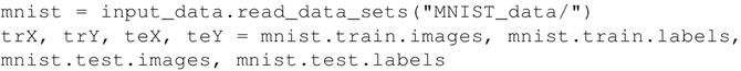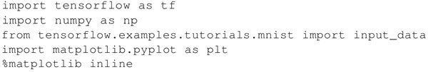 从 TensorFlow 中获取 MNIST 数据,这里要注意的一点是,标签并没有进行独热编码,因为并没有使用标签来训练网络。自动编码机是通过无监督学习进行训练的: