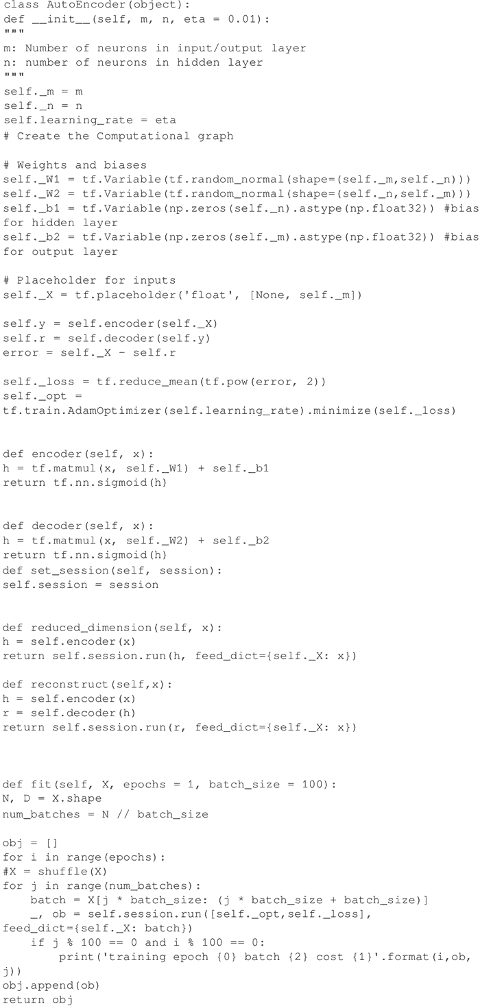 声明 AutoEncoder 类,使用 init 方法初始化自动编码机的权重、偏置和占位符,也可以在 init 方法中构建全部的计算图。还需要定义编码器、解码器,set_session(会话建立)和 fit 方法。此处构建的自动编码机使用简单的均方误差作为损失函数,使用 AdamOptimizer 进行优化: