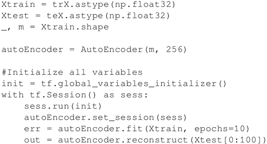 训练时将输入数据转换为 float 型,初始化所有变量并运行会话。在计算时,目前只是测试自动编码机的重构能力: