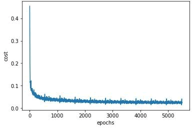 可以看到,随着网络的学习,损失/成本是下降的,当训练周期达到 5000 时,几乎是在一条线上振荡,这意味着进一步增加训练周期将不再有用。如果现在还想要改进模型,应该调整学习率、批量大小和优化器等超参数。