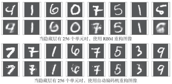 有意思的是,在前面的代码中,维数从输入的 784 降到了 256,但是网络仍然可以重构原始图像。将自动编码机性能与 RBM 进行对比,其中隐藏层维数相等: