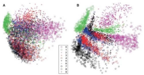 下图是 Hinton 的论文“Reducing the dimensionality of data with Neural Networks”复现的结果,图 A 显示 PCA 的结果,图 B 是由 RBM 堆叠的自动编码机(每层节点为 784-1000-500-250-2)的结果: