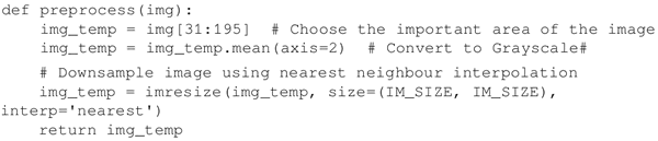 这里利用 Scipy 的 imresize 函数来下采样图像。函数 preprocess 会在将图像输入到 DQN 之前,对图像进行预处理: