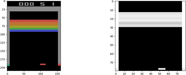 IM_SIZE 是一个全局参数,这里设置为 80。该函数具有描述每个步骤的注释。下面是预处理前后的观测空间: