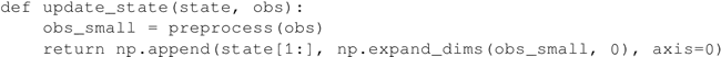 本节考虑四个动作和观测序列来确定当前情况并训练智能体。update_state 函数用来将当前观测状态附加到以前的状态,从而产生状态序列: