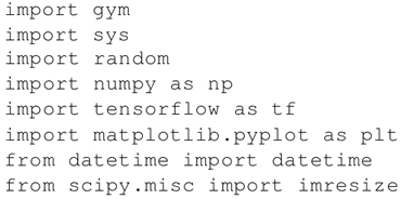 导入必要的模块。使用 sys 模块的 stdout.flush() 来刷新标准输出(此例中是计算机屏幕)中的数据。random 模块用于从经验回放缓存(存储过去经验的缓存)中获得随机样本。datatime 模块用于记录训练花费的时间: