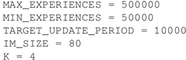 定义训练的超参数,可以尝试改变它们,定义了经验回放缓存的最小和最大尺寸,以及目标网络更新的次数: