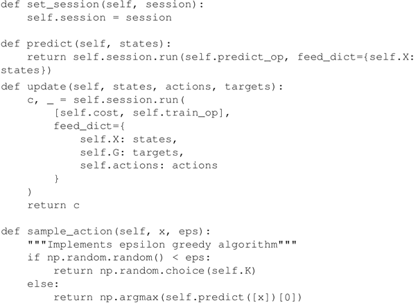 类中用 set_session() 函数建立会话,用 predict() 预测动作值函数,用 update() 更新网络,在 sample_action() 函数中用 Epsilon 贪婪算法选择动作: