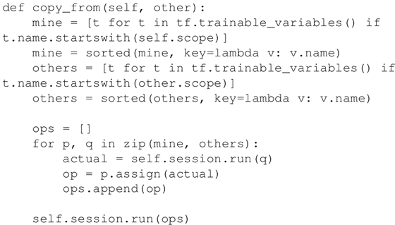 定义将主 DQN 网络的参数复制到目标网络的方法如下: