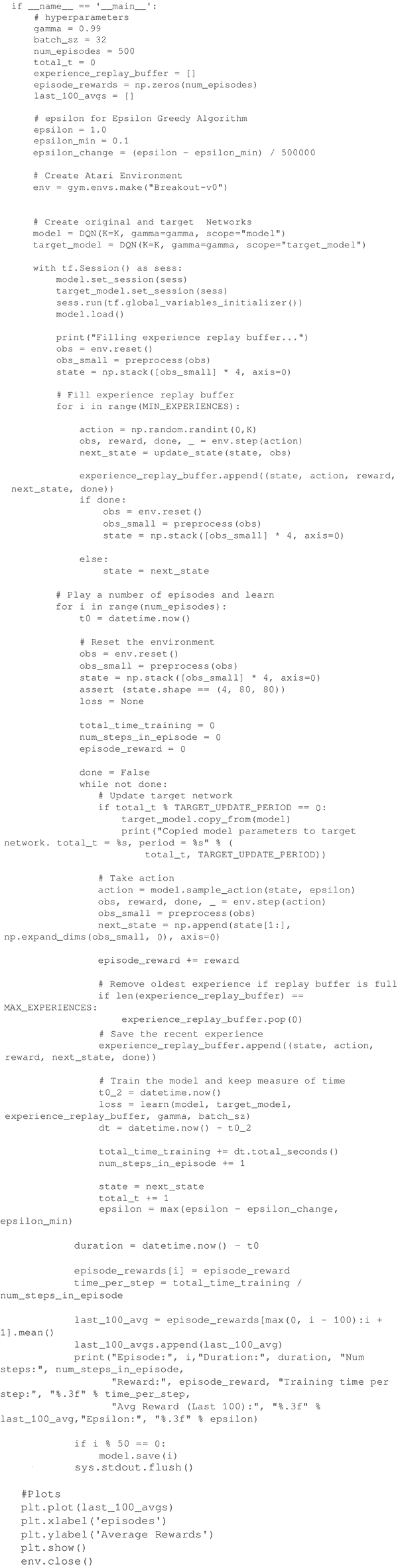 现在已经在主代码中定义了所有要素,下面构建和训练一个 DQN 网络来玩 Atari 的游戏。代码中有详细的注释,这主要是之前 Q learning 代码的一个扩展,增加了经验回放缓存,所以不难理解: