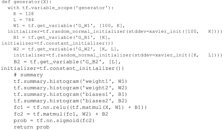 定义输入 X 的生成器。首先定义一个维数为 [100,K=128] 的矩阵 W1,按照正态分布进行初始化。需要注意的是,100 是生成器使用的初始化噪音Z的任意值。接着,定义维度为 [K=256] 的偏置 B1。同样,定义一个维数为 [K=128,L=784] 的矩阵 W2 和一个维数为 [L=784] 的偏置 B2。