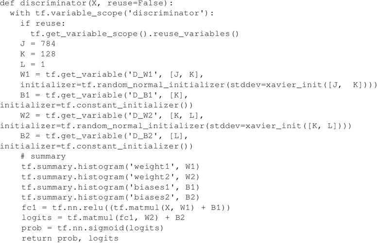 定义输入 X 的鉴别器。原则上,这与生成器非常相似。主要区别在于,如果参数重用为真,那么调用 scope.reuse_variables() 来触发重用。接着定义两个密集层:
