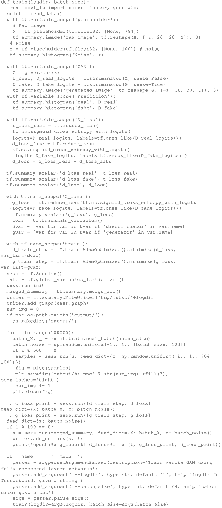 定义训练函数。首先,读取 MNIST 数据,然后为一个标准的 MNIST 手写字符定义一个形状为 28×28 的单通道矩阵 X。接着定义大小为 100 的噪声矢量 z——这是在高质量 GAN 论文中采用的常见选择。下一步是在 z 上调用生成器并将结果赋值给 G。之后,将 X 代入鉴别器而不再重复使用。接着把伪造/虚假的 G 结果代入鉴别器,并重新使用经过训练形成的权重。