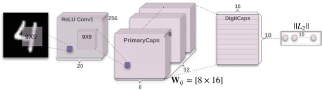 该架构非常浅显易懂,只有两个卷积层和一个全连接层。Conv1 有 256个9×9 卷积核,它的步长为 1,由 ReLU 激活。该层的作用是将像素强度转换为局部特征检测器的活动,然后将其作为 PrimaryCapsules 的输入。PrimaryCapsules 是一个 32 通道的卷积 capsule 层;每个主 capsule 包含 8 个卷积单元,带有一个 9×9 内核,步幅为 2。