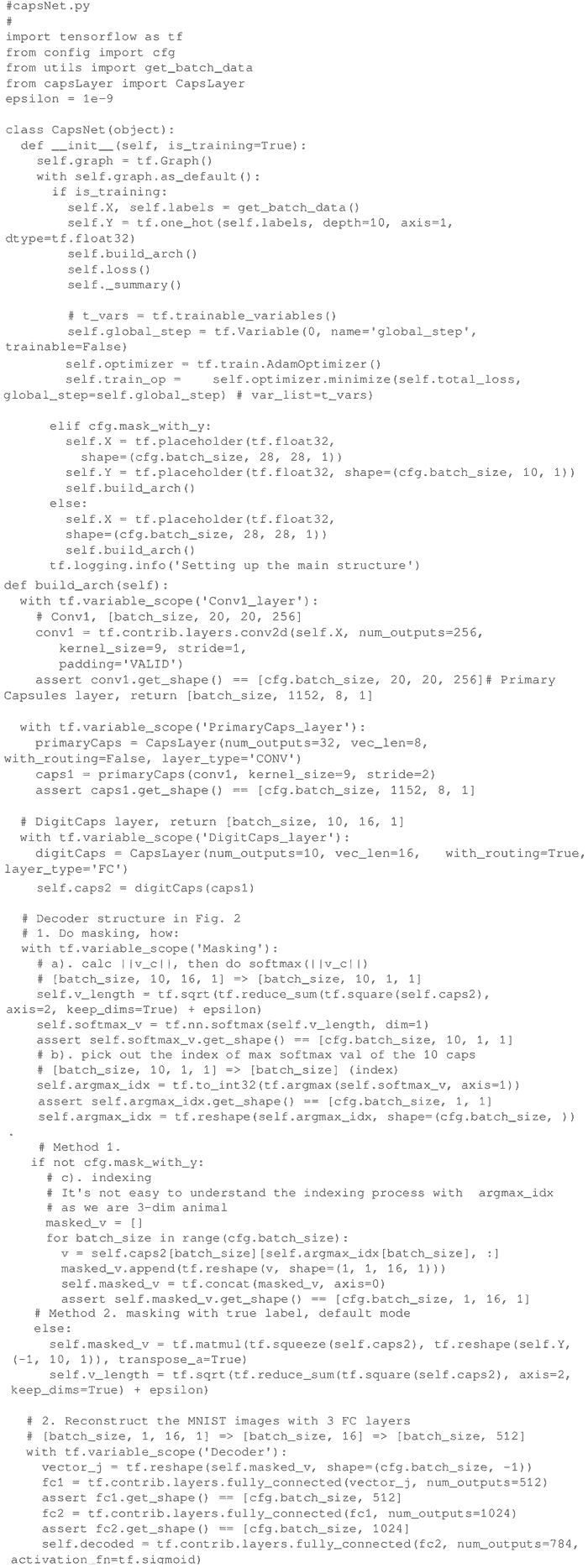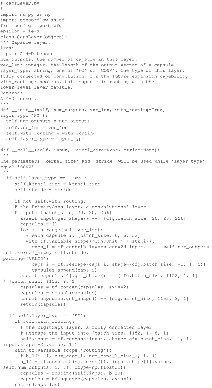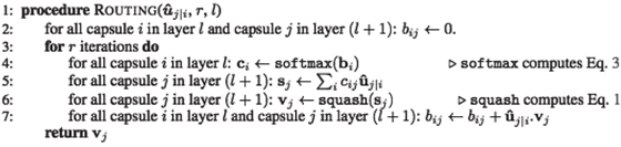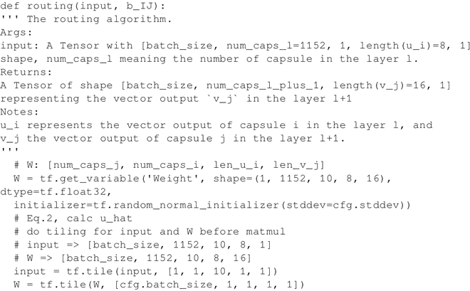 Procedure 1 路由算法:以下方法在前面的图像中实现了步骤 1中描述的步骤。值得注意的是,输入是来自第 l 层中的 1152 个 capsule 的 4D 张量。输出是在 l+1 层中 capsule j 的矢量输出“v_j”的形状张量[batch_size,1,length(v_j)=16,1]: