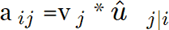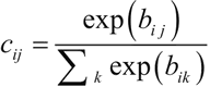 其中,cij 为取决于迭代动态路由过程的耦合系数。capsules i 与所有上层的 capsule 的耦合系数之和为 1,它取决于路由 softmax。路由 softmax 的初始分对数 bij 是 capsule i 与 capsule j 的先验概率的对数。