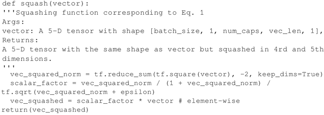 回顾一下非线性激活压缩函数。它的输入是一个形状为 [batch_size,num_caps,vec_len,1] 的 4D 矢量,输出是一个与矢量形状相同但在第三维和第四维上压缩的 4D 张量。给定一个矢量输入,目标是计算公式 1 中表示的值,如下所示: