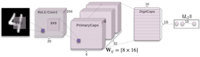 此外,Hinton 等人也表明:一种有差别训练的多层 capsule 系统在 MNIST 上实现了最新的性能,并且在识别高度重叠的数字方面比卷积网络好得多。文章“Dynamic Routing Between Capsules”展示了简单的 CapsNet 架构: