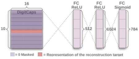 值得注意的是,本文描述了一种重构技术作为正则化方法。来自论文:使用额外的重构损失来鼓励数字 capsule 对输入数字的实例化参数进行编码。在训练期间,掩盖了除了正确数字 capsule 的活动矢量之外的所有数据。