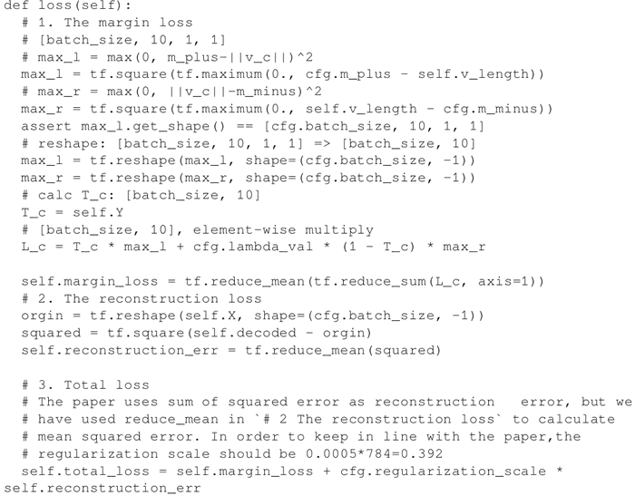 边际损失函数是本文定义中的另一个重要部分。在以下文章的片段引用(等式4)中进行了解释,并在loss(..)方法中执行,该方法包括三项损失:差额损失、重构损失和总损失: