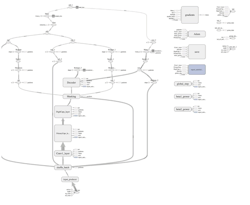 CapsNet 与最先进的深度学习网络是不同的,它使用浅层网络,让 capsule 层嵌套在其他层中,而不需要增加更多的层和让网络深层次化。每个 capsule 被用于检测图像中的特定实体,一个动态的路由机制将检测到的实体发送给父层。对于 CNN 来说,要从不同角度识别一个物体,你必须从很多不同的方面来考虑成千上万的图像。Hinton 认为,这些层次中的冗余将会使 capsule 网络能够从多个角度和在不同情况下识别物体,相比 CNN,使用的数据更少。检验一下 Tensorboard 所示的网络: